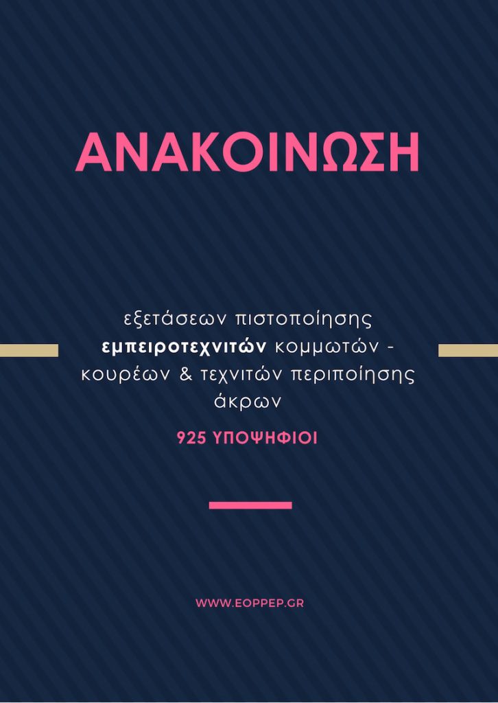 Ο Εθνικός Οργανισμός Πιστοποίησης Προσόντων και Επαγγελματικού Προσανατολισμού (Ε.Ο.Π.Π.Ε.Π.) θα διεξάγει την Κυριακή, 15 Ιουνίου 2025, τις εξετάσεις πιστοποίησης επαγγελματικής επάρκειας Κομμωτών – Κουρέων και Τεχνιτών Περιποίησης Χεριών Ποδιών σε τρία (3) εξεταστικά κέντρα που θα λειτουργήσουν για όλους τους υποψηφίους την ίδια ώρα, στην Αθήνα, τη Θεσσαλονίκη και το Ηράκλειο της Κρήτης στις παρακάτω διευθύνσεις: ΕΠΑΣ ΡΕΝΤΗ Πέτρου Ράλλη 83, Αγ. Ιωάννης Ρέντης Τ.Κ. 182 33 – Αττική ΔΟΜΗ ΚΕΝΤΡΙΚΗΣ ΜΑΚΕΔΟΝΙΑΣ ΚΕΚ ΓΣΕΒΕΕ – ΚΔΒΜ Κωλέττη 24, ΤΚ: 54627 – Θεσσαλονίκη ΔΟΜΗ ΚΡΗΤΗΣ ΚΕΚ ΓΣΕΒΕΕ – ΚΔΒΜ Βασ. Πατρικίου 11, Τ.Κ. 71409 – Ηράκλειο Εντός της ημέρας οι υποψήφιοι…