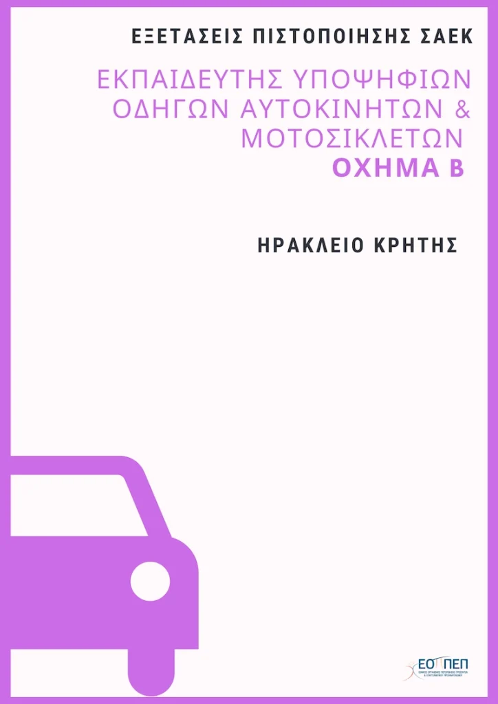 Ο Εθνικός Οργανισμός Πιστοποίησης Προσόντων Επαγγελματικού Προσανατολισμού (Ε.Ο.Π.Π.Ε.Π.) ανακοινώνει τη διενέργεια του Πρακτικού Μέρους (ΟΧΗΜΑ Β) των Εξετάσεων Πιστοποίησης Αρχικής Επαγγελματικής Κατάρτισης της 1ης εξεταστικής περιόδου 2024, των ειδικοτήτων Σ.Α.Ε.Κ. «Εκπαιδευτής Υποψηφίων Οδηγών Αυτοκινήτων και Μοτοσικλετών (Ε.Υ.Ο.Α.Μ) (Ν.2009/1992 και Ν. 4186/2013)» στο Εξεταστικό Κέντρο Θεσσαλονίκης. Στις εξετάσεις θα λάβουν μέρος 24 υποψήφιοι, οι οποίοι θα εξεταστούν στο Πρακτικό Μέρος της Κατηγορίας Οχήματος Β, ως ακολούθως: Εξεταστικό ΚέντροΧώρος ΕξετάσεωνΗμερομηνίες Εξετάσεων ΘΕΣΣΑΛΟΝΙΚΗΣ Στρατάρχη Παπάγου και Ωκεανού, δίπλα από το Swimming Family Academy – Τ.Κ. 56224 – Εύοσμος ΘεσσαλονίκηςΣΑΒΒΑΤΟ 11/10/2025Ώρα έναρξης: 08:00Ώρα προσέλευσης: 07:00ΚΥΡΙΑΚΗ 12/10/2025Ώρα έναρξης: 08:00Ώρα προσέλευσης: 07:00ΣΑΒΒΑΤΟ 18/10/2025Ώρα έναρξης: 08:00Ώρα…