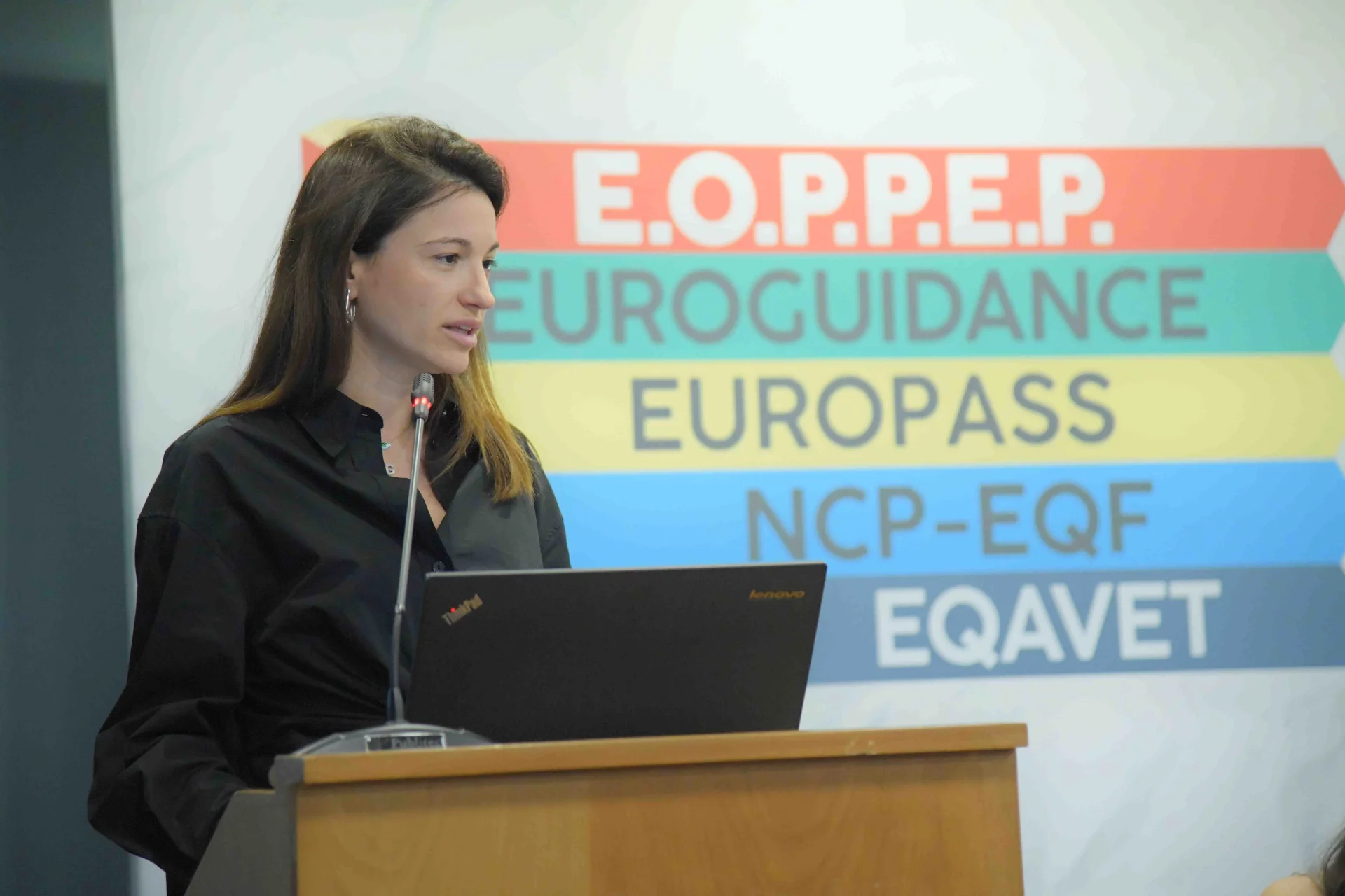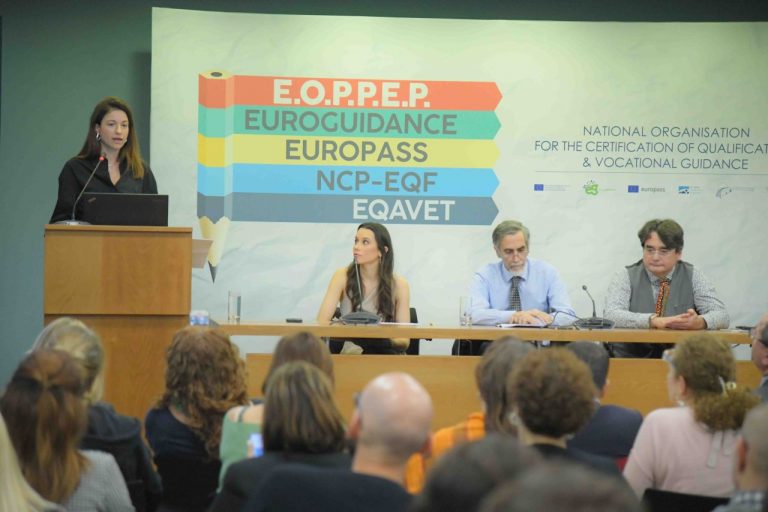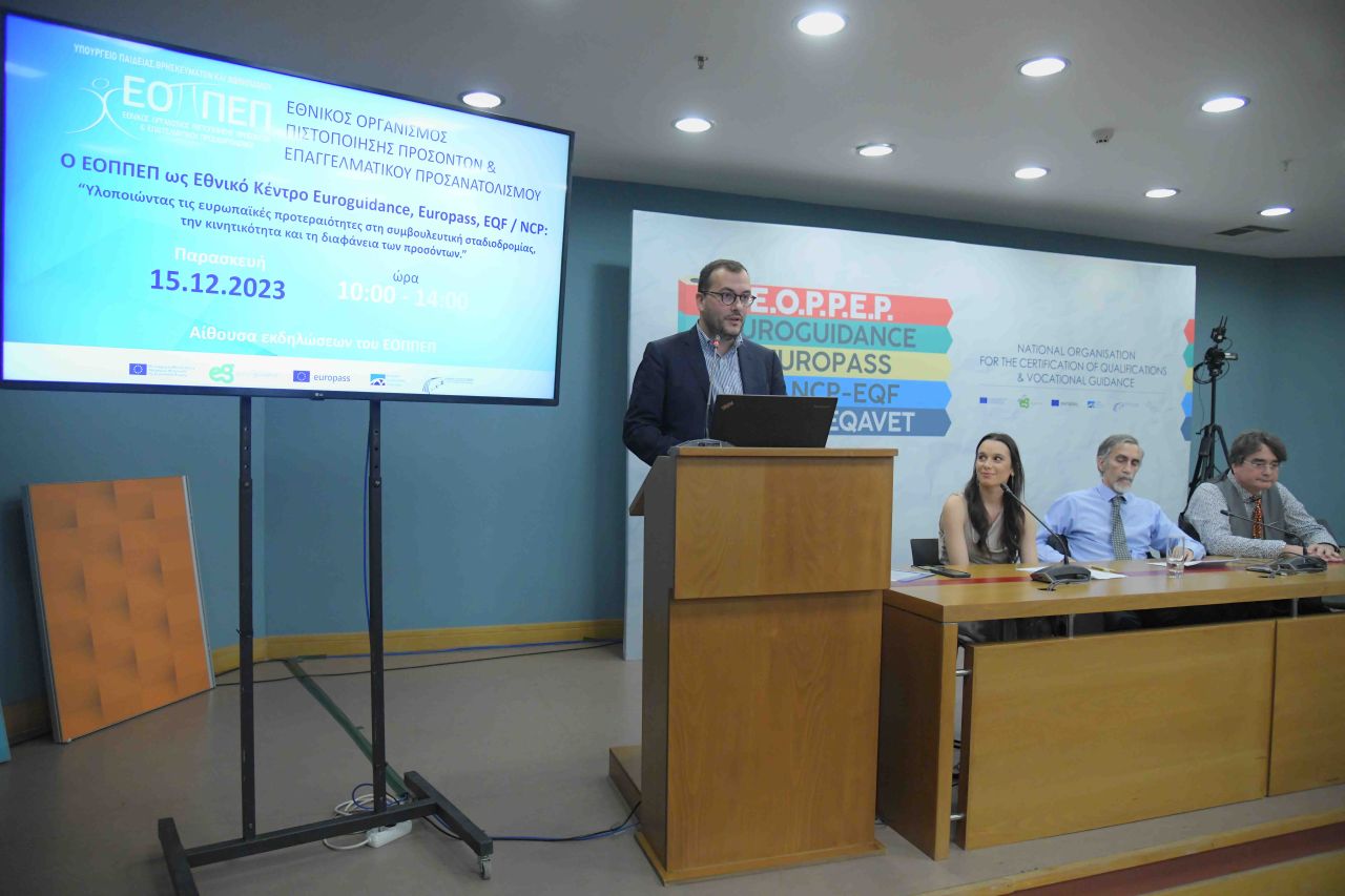 Ο προϊστάμενος της Διεύθυνσης Συμβουλευτικής και Επαγγελματικού Προσανατολισμού, Δρ. Γαϊτάνης Δημήτριος και ο προϊστάμενος του τμήματος Εθνικού Πλαισίου Προσόντων, κ Σπύρος Παπαϊωάννου, παρουσίασαν το ρόλο του ΕΟΠΠΕΠ, ως Εθνικό Κέντρο Euroguidance, Europass και Ευρωπαϊκού Πλαισίου Προσόντων και τη σύνδεση της συμβουλευτικής σταδιοδρομίας με τη διαφάνεια των προσόντων.