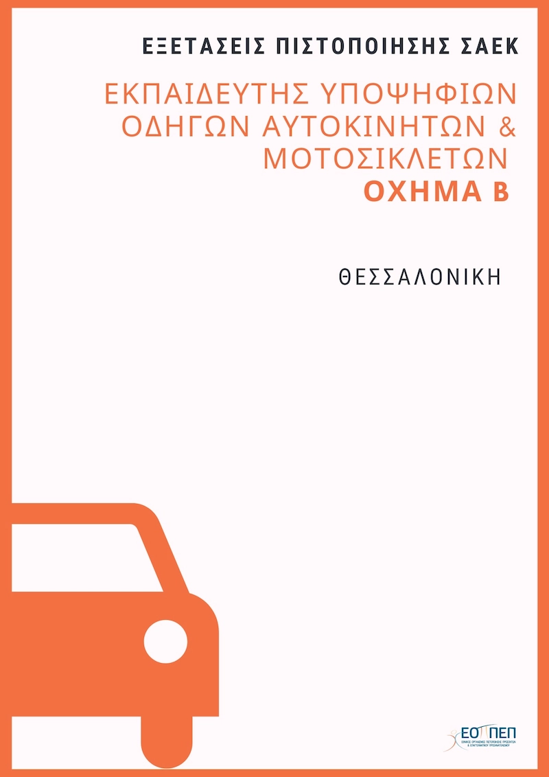 Ο Εθνικός Οργανισμός Πιστοποίησης Προσόντων Επαγγελματικού Προσανατολισμού (Ε.Ο.Π.Π.Ε.Π.) ανακοινώνει τη διενέργεια του Πρακτικού Μέρους (ΟΧΗΜΑ Β) των Εξετάσεων Πιστοποίησης Αρχικής Επαγγελματικής Κατάρτισης της 1ης εξεταστικής περιόδου 2024, των ειδικοτήτων Σ.Α.Ε.Κ. «Εκπαιδευτής Υποψηφίων Οδηγών Αυτοκινήτων και Μοτοσικλετών (Ε.Υ.Ο.Α.Μ) (Ν.2009/1992 και Ν. 4186/2013)» στο Εξεταστικό Κέντρο Θεσσαλονίκης.