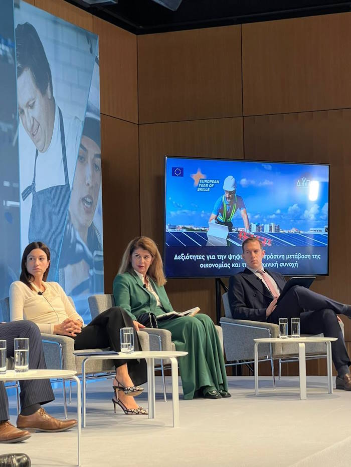 Με θέμα τις ‘Δεξιότητες του ανθρωπίνου δυναμικού που απαιτούνται σε μια ψηφιακή και πράσινη μετάβαση της οικονομίας’ διεξήχθη συζήτηση σε πάνελ που συμμετείχαν η Διευθύνουσα Σύμβουλος του ΕΟΠΠΕΠ μαζί με το Διοικητή της ΔΥΠΑ Σπύρο Πρωτοψάλτη, το μέλος του Εθνικού Συμβουλίου Δεξιοτήτων από τη ΓΣΕΕ Χρήστο Γούλα και τη Ντόρα Οικονόμου από τον ΣΕΒ και το Σταύρο Γαβρόγλου Ειδικό Εμπειρογνώμονα από τη Μ.Ε.Κ.Υ. . Στη συζήτηση αναδείχθηκε ο σημαντικός ρόλος του ΕΟΠΠΕΠ και της ΔΥΠΑ στη σύνδεση της επαγγελματικής κατάρτισης και της πιστοποίησης με την αγορά εργασίας καθώς και η σημασία που έχει η συνεργασία των δύο Οργανισμών. Η κα Ρεμπούτσικα υπογράμμισε ότι ‘Ο ΕΟΠΠΕΠ ολοκληρώνει έργα ιδιαίτερης σημασίας, που υλοποιεί σε συνεργασία με τους κοινωνικούς εταίρους, όπως είναι η ανάπτυξη και η πιστοποίηση επαγγελματικών περιγραμμάτων αλλά και οδηγών κατάρτισης’.
